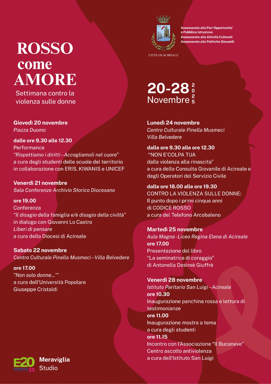 In occasione della Giornata internazionale per l’eliminazione della violenza contro le donne, la Città di Acireale, in collaborazione con istituzioni, istituti scolastici, associazioni, club service, artisti e scrittori organizza “Rosso come Amore”, una rassegna di eventi volti a sensibilizzare l’opinione pubblica e lanciare un forte grido di stop alla violenza.